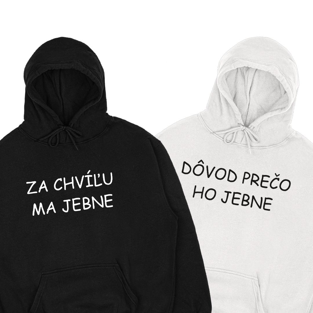 Mikiny párové „Za chvíľu ma jebne/Dôvod prečo“ (2pack)
